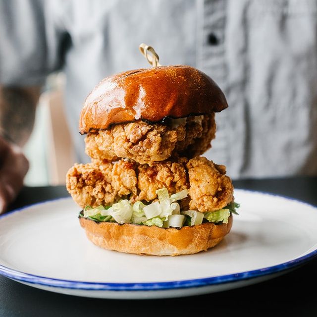 Buttermilk Brined, Dredged Fried Chicken, Shredded Lettuce, and BH Ranch on a Toasted Bun